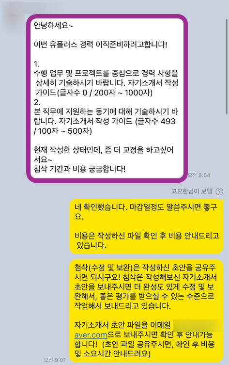 급하게 요청드렸음에도 제공한 초안을 바탕으로 완성도 있는 자기소개서를 작성해 주셨습니다. 자기소개서 유료 서비스는 처음 받아봤는데 진작 받을 걸 그랬습니다. 받고 읽자마자 전문가는 확실히 다르다는 걸 깨달았습니다. 다음에도 필요하다면 고민없이 이 분에게 요청드리려고 합니다.